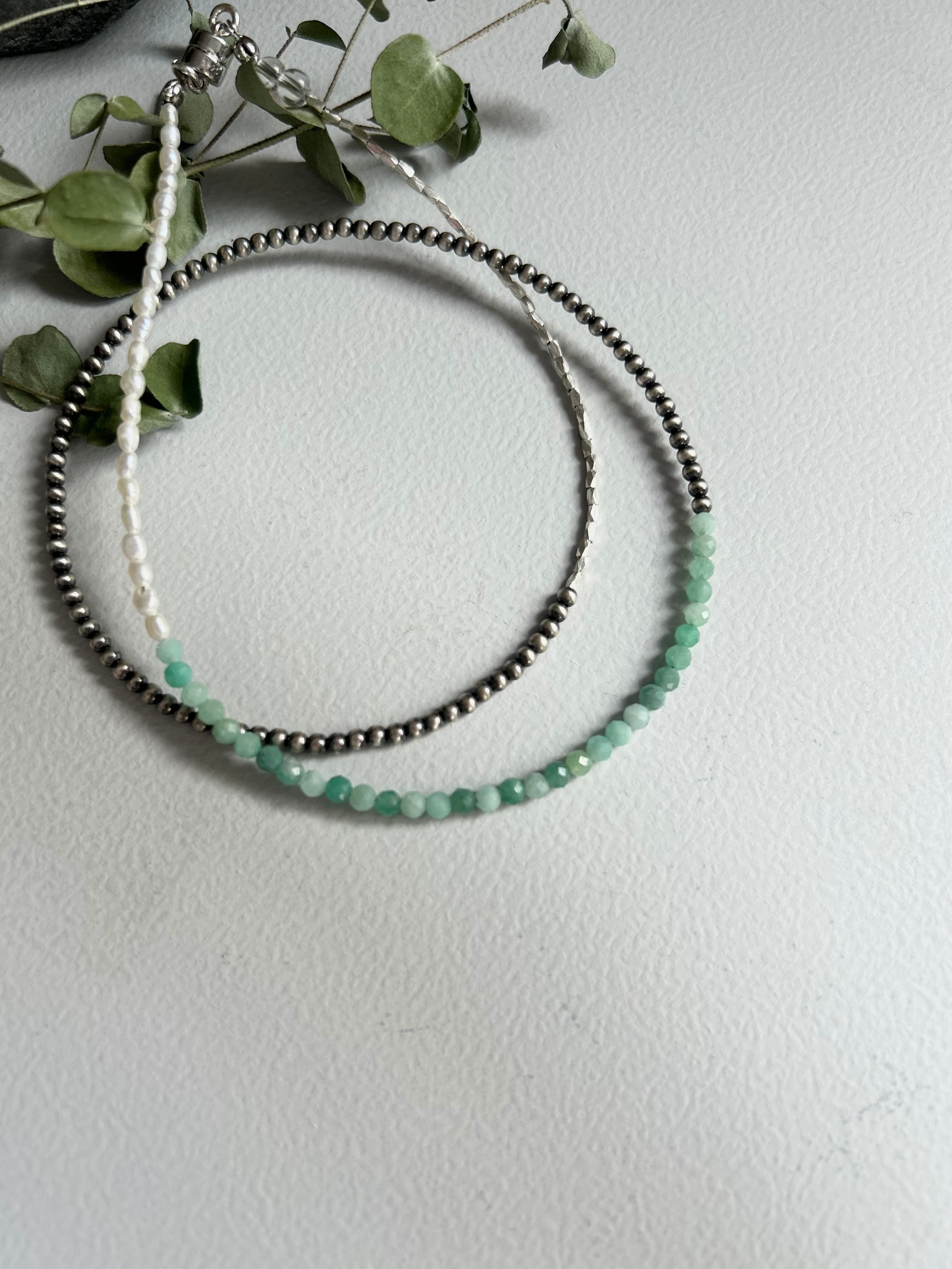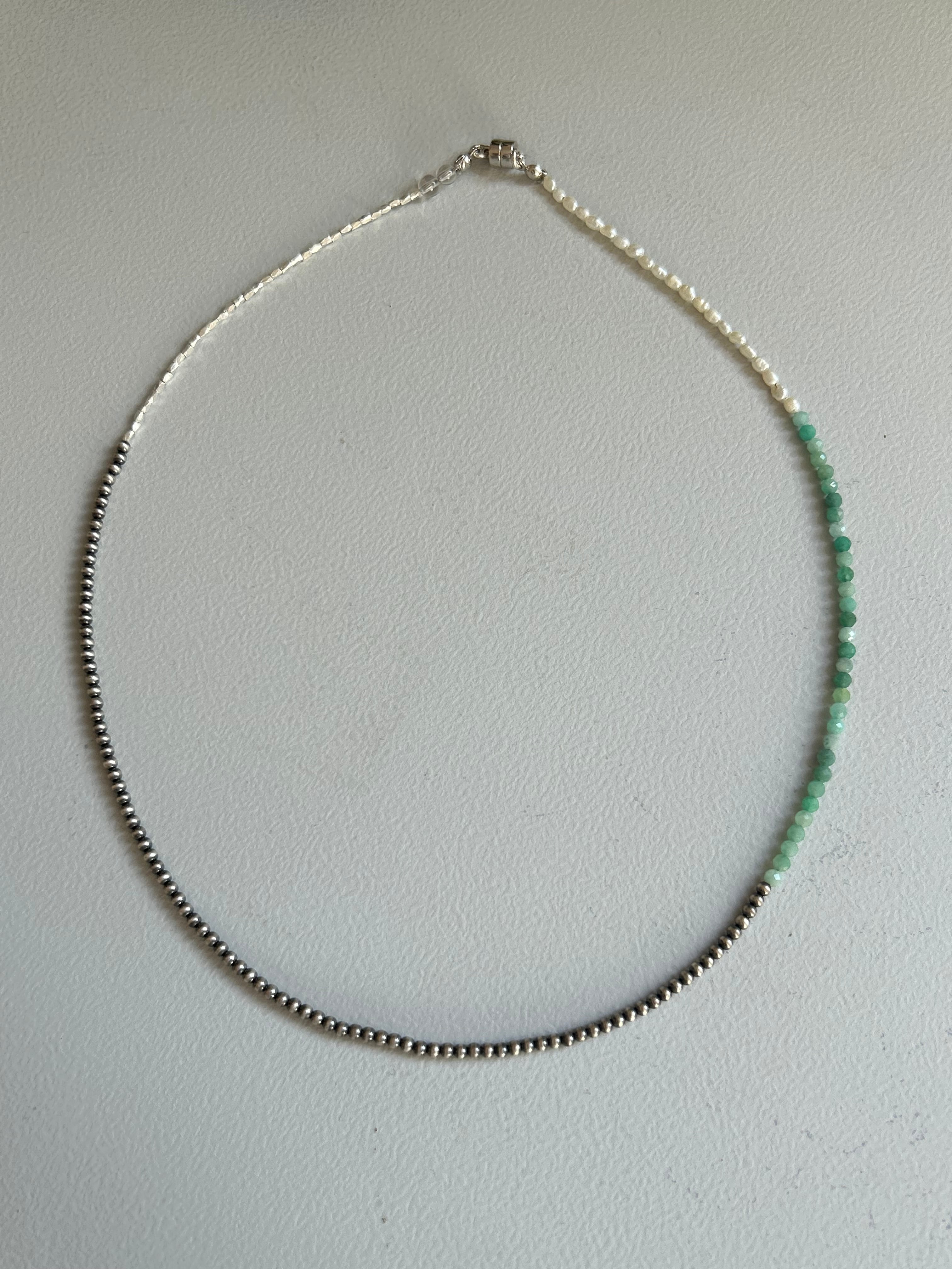 素材:2mmナバホパール、2mmエメラルド、ケシパール、4mm水晶、カレンシルバー