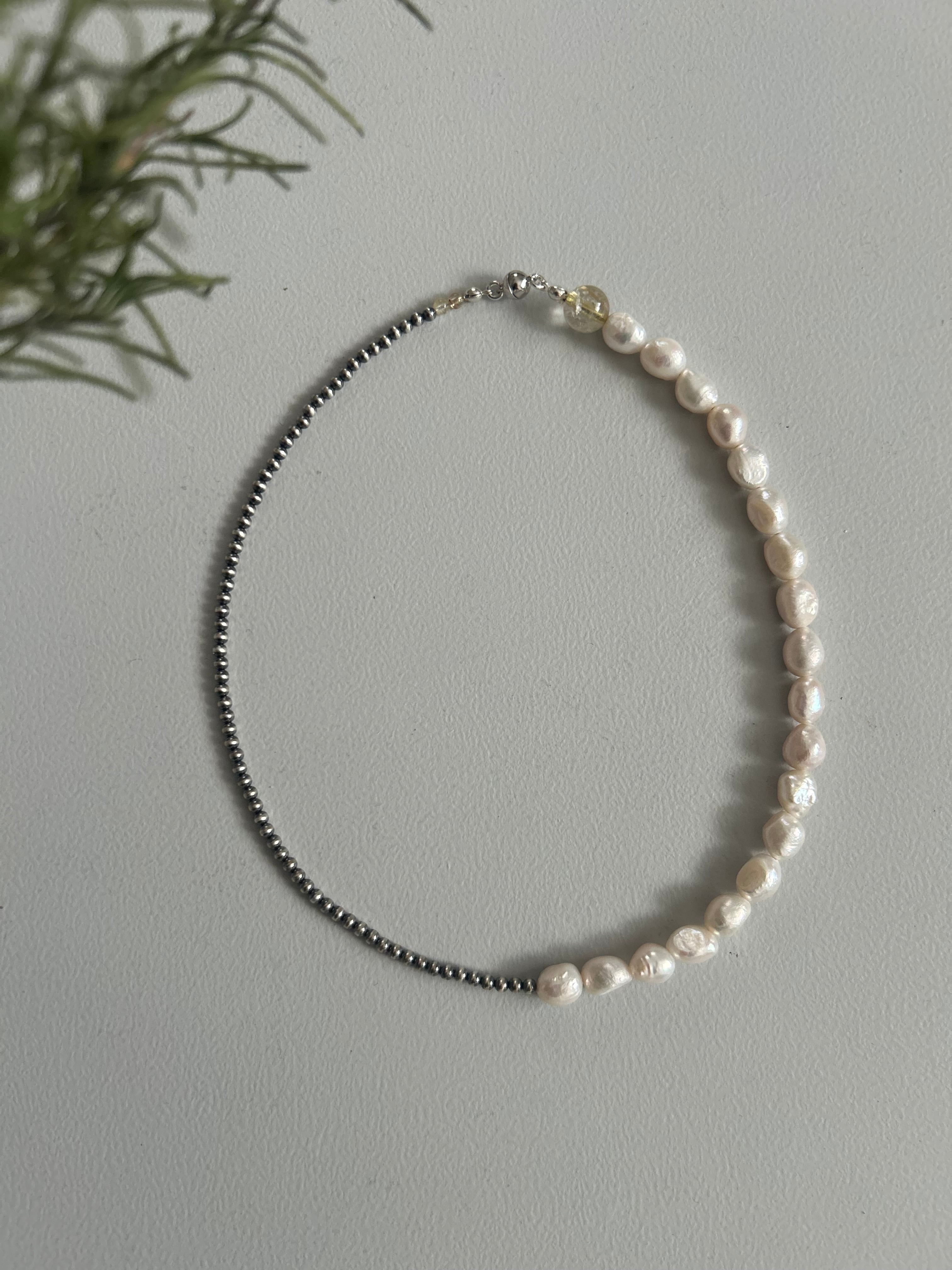 【41.5cm】ナバホパール × バロックパール × ルチルクォーツ 前後で表情が変わる、ハーフデザインネックレス